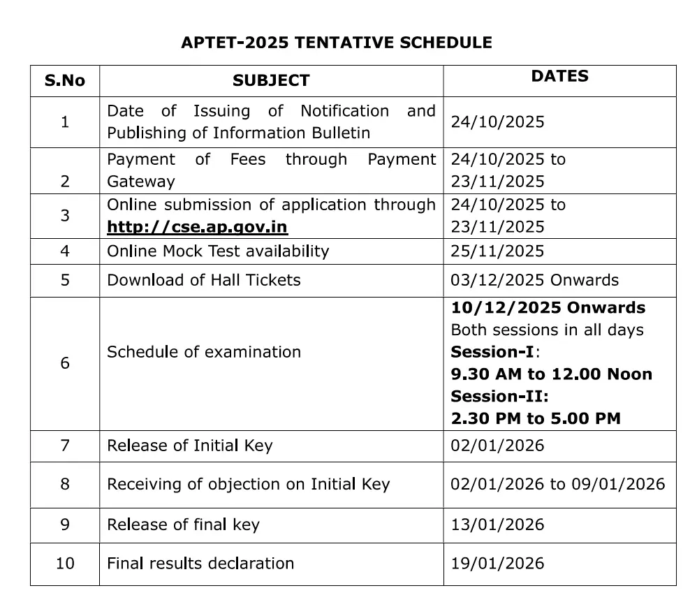 | AP TET Exam Date 2025 | From 10th December 2025 onwards |