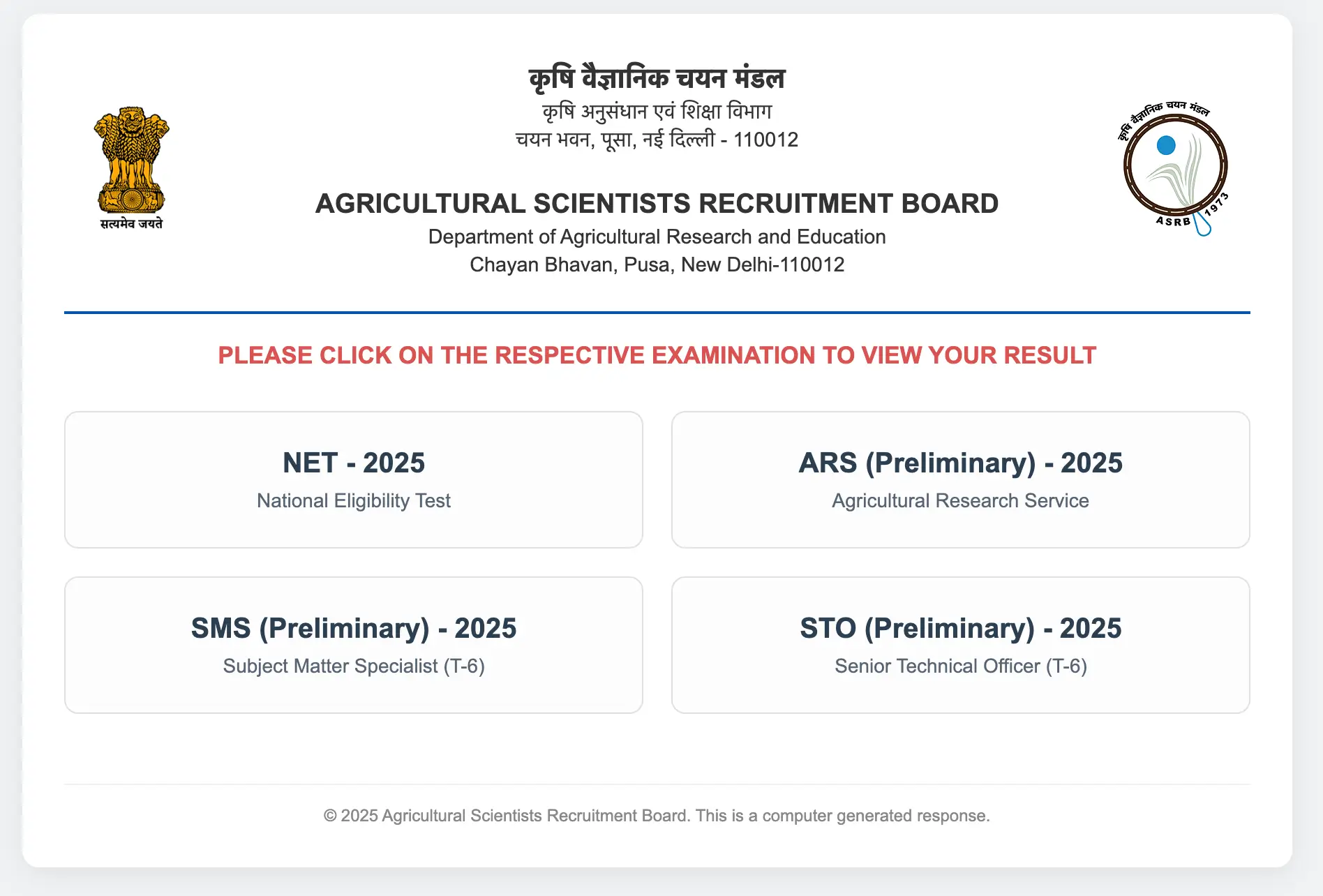 Agricultural Scientist Recruitment Board (ASRB) has released the ASRB NET Result 2025 for ASRB National Eligibility Test (NET) held for posts of Agricultural Research Service (ARS), Subject Matter Specialist (SMS), and Senior Technical Officer (STO). The result and scorecard link is now available at the official website www.asrb.org.in, and candidates need their Roll Number and Date of Birth to check their result status.