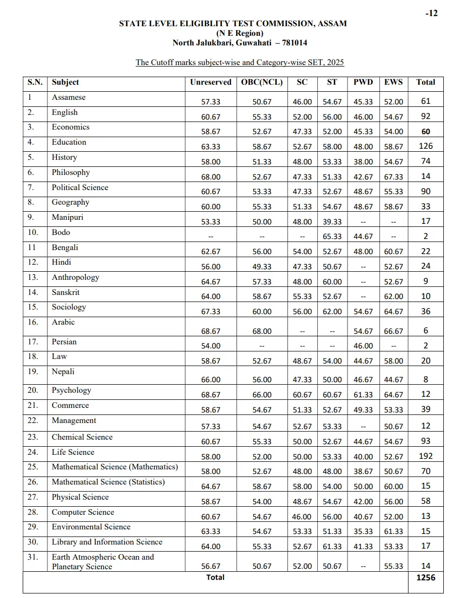 Only those candidates who score more than the cut off marks are declared qualified and will also be issued their qualifying certificate. Below is the Assam SLET Cut Off 2025 released for Assam State Level Eligibility Test 2025.