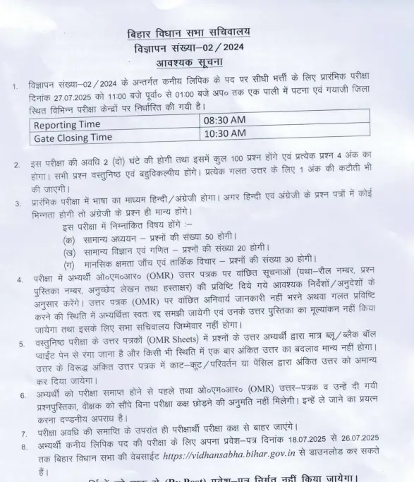 Bihar Vidhan Sabha has released a notice regarding the exam date for Junior Clerk under Advertisement No.-02/2024 on 17th July 2025 on its official website, www.vidhansabha.bihar.gov.in. Vidhan Sabaha states that Bihar Vidhan Sabha Junior Clerk Exam 2025 will be conducted on 27th July 2025 at various exam centers across the districts of Patna and Gaya. Candidates can download the exam Schedule PDF and read the exam day instructions mentioned in it.