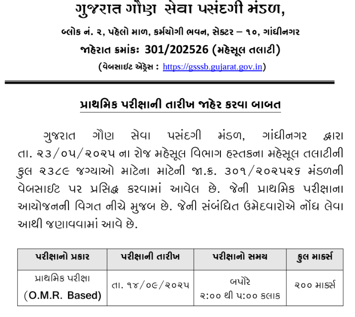 - Select GSSSB/202526/301 Revenue Talati- Class- III.