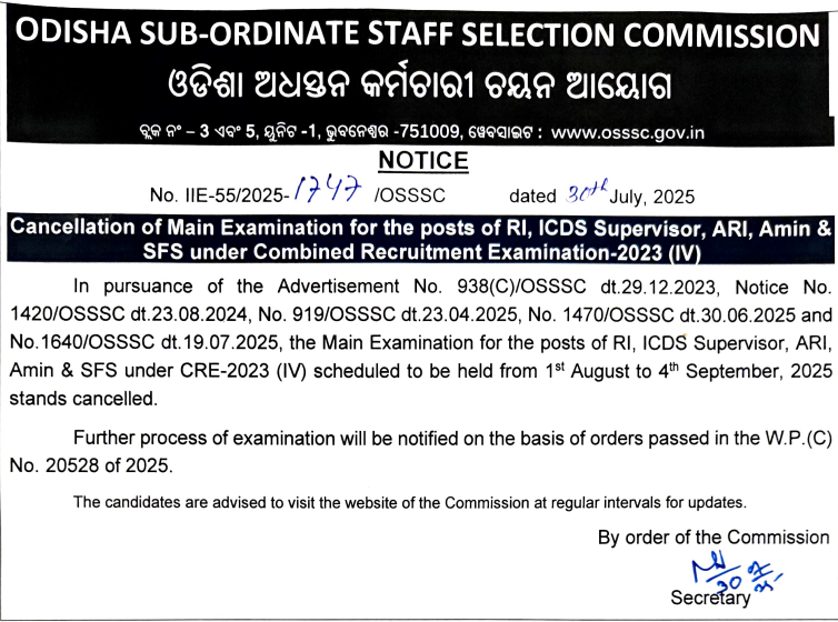 Odisha Subordinate Staff Selection Commission (OSSSC) has officially announced the OSSC CRE Preliminary Examination for the posts of RI, ICDS Supervisor, ARI, Amin & SFS under Combined Recruitment Examination–2023(IV). As per the official schedule released on 1st September 2025, OSSSC RI RI Amin 2023 (IV) was conducted from 8th October 2025 to 13th November 2025 in all districts of the State. Candidates can check the exam schedule from the article.