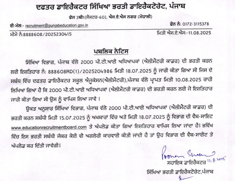 Department of School Education, Punjab, has released the official notice on 11th August 2025 regarding the withdrawal of the Punjab PTI Notification, which was released for 2000 PTI vacancies. A new notification PDF for PTI vacancies along with details information will be released soon at the official website www.educationrecruitmentboard.com. Interested candidates must bookmark our page for the latest updates regarding the recruitment drive.