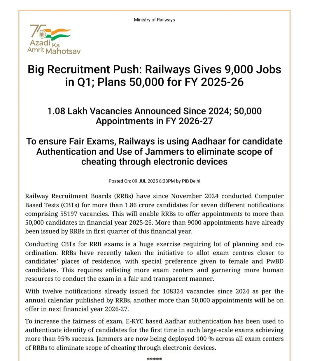 Within the first quarter of the financial year 2025-26, Railways has given jobs to more than 9,000 candidates by sending them appointment letters, with over 50,000 candidates to join Indian Railways by the end of the year. For selecting candidates, Computer-Based Tests (CBTs) for more than 1.86 crore candidates for 7 job opportunities for over 55,197 vacancies have been conducted solely by the Railway Recruitment Board.