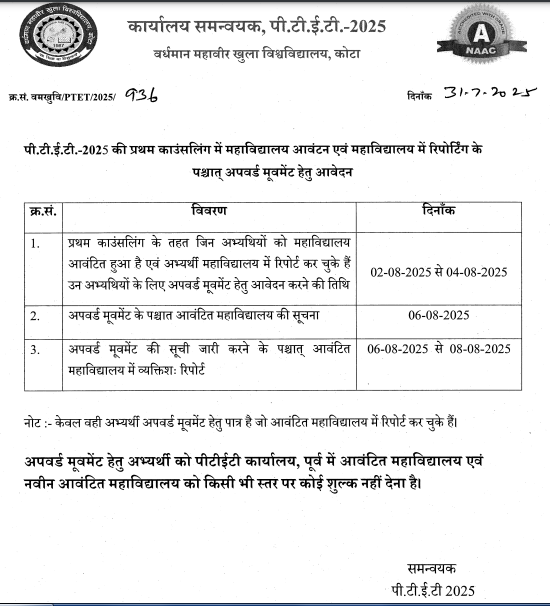 Vardhman Mahaveer Open University (VMOU) has released the PTET-2025 College 2nd Allotment Letter for the two-year B.Ed. and four-year integrated B.A. B.Ed/B.Sc. B.Ed programs today, 18th August 2025, notifying candidates about their allotted seats in B.Ed or integrated BA‑B.Ed/BSc‑B.Ed programs across various participating teacher education colleges in Rajasthan. Candidates who participated in the second round of counselling have to report to the allotted college between 18th to 25th August 2025.