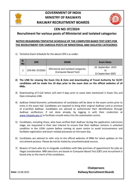 | RRB Railway Teacher Exam Date 2025 | 10th to 12th September 2025 |