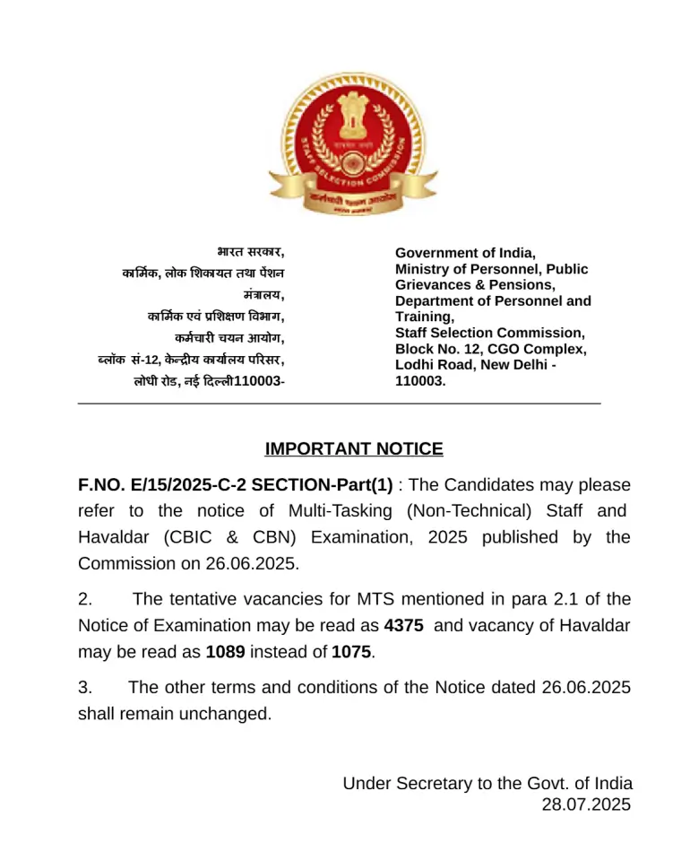 An official notice regarding vacancies to be filled through Multi Tasking (Non-Technical) Staff, and Havaldar (CBIC & CBN) Examination 2025 is released on 28th July 2025. The notice says “The tentative vacancies for MTS mentioned in para 2.1 of the Notice of Examination may be read as 4375 and the vacancy of Havaldar may be read as 1089 instead of 1075”.