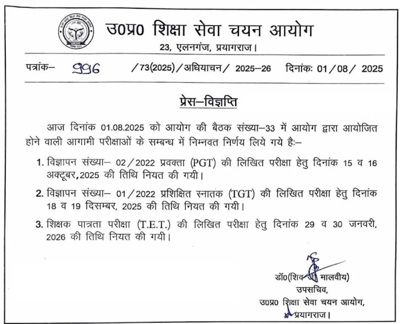 Uttar Pradesh Secondary Education Service Selection Board (UPSESSB) has made an announcement regarding the postponement of UP PGT Exam Date 2025 through the official notice released at www.upsessb.org. The official UP PGT Exam schedule will be released soon at the official portal of UPSESSB. As per the previous official notice, the UP TGT Exam Date is the same, which is scheduled for 18th and 19th December 2025.