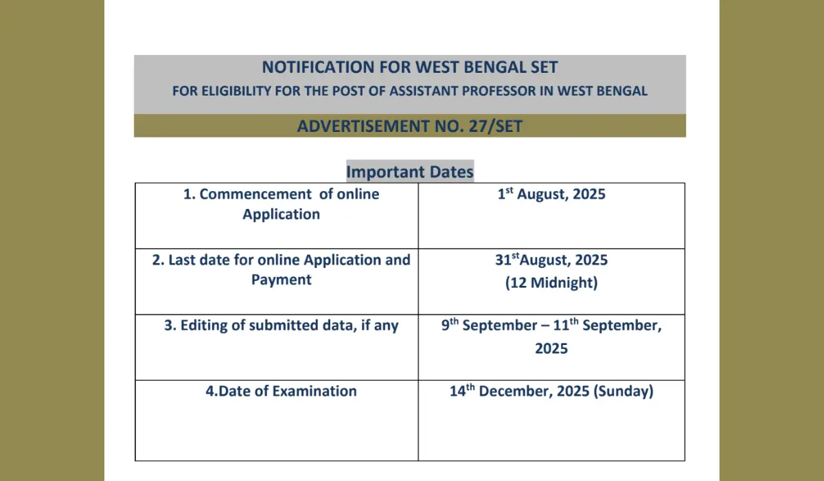 WB SET Exam Date 2025 14th December 2025 (Sunday)