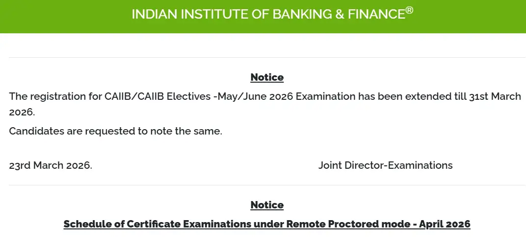 The Indian Institute of Banking and Finance has officially extended the last date for registration for the CAIIB and CAIIB Electives examinations scheduled for the May/June 2026 session. As per the schedule, the CAIIB Exam 2026, the last date to apply online has been extended till 31st March 2026. Candidates who missed the previous opportunity can aply online through the official website of http://www.iibf.org.in/.