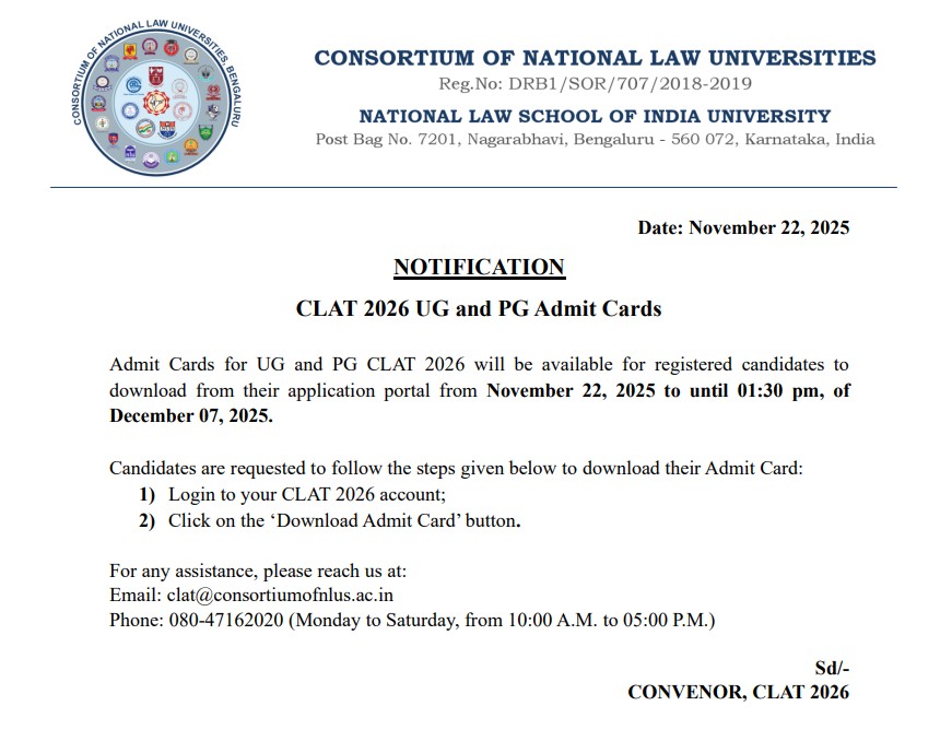 The Consortium of National Law Universities (NLUs) has released the CLAT Admit Card 2026 for the upcoming UG and PG exams via the candidate's portal on November 22, 2025. The Hall Ticket download link is now available at the CLAT Admit Card 2026 login, i.e www.consortiumofnlus.ac.in, which is available until 01:30 pm, December 07, 2025. To appear in the exam. Applicants must bring their CLAT 2026 exam hall ticket, along with one valid photo ID, to the exam centre. Any candidate who fails to present their admit card on exam day will be denied the opportunity to take the exam. To make the process easier, the steps to download the CLAT 2026 Call Letter/Admit Card and the direct link are added below on this page.