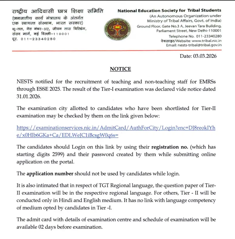 To download the EMRS Tier 2 Exam City Intimation Slip 2026, the link has been made available on 3rd March 2026, at the National Education Society for Tribal Students' official website www.emrs.tribal.gov.in. For the ease of candidates, we have also provided a direct link below to check your EMRS Exam City Slip 2026.