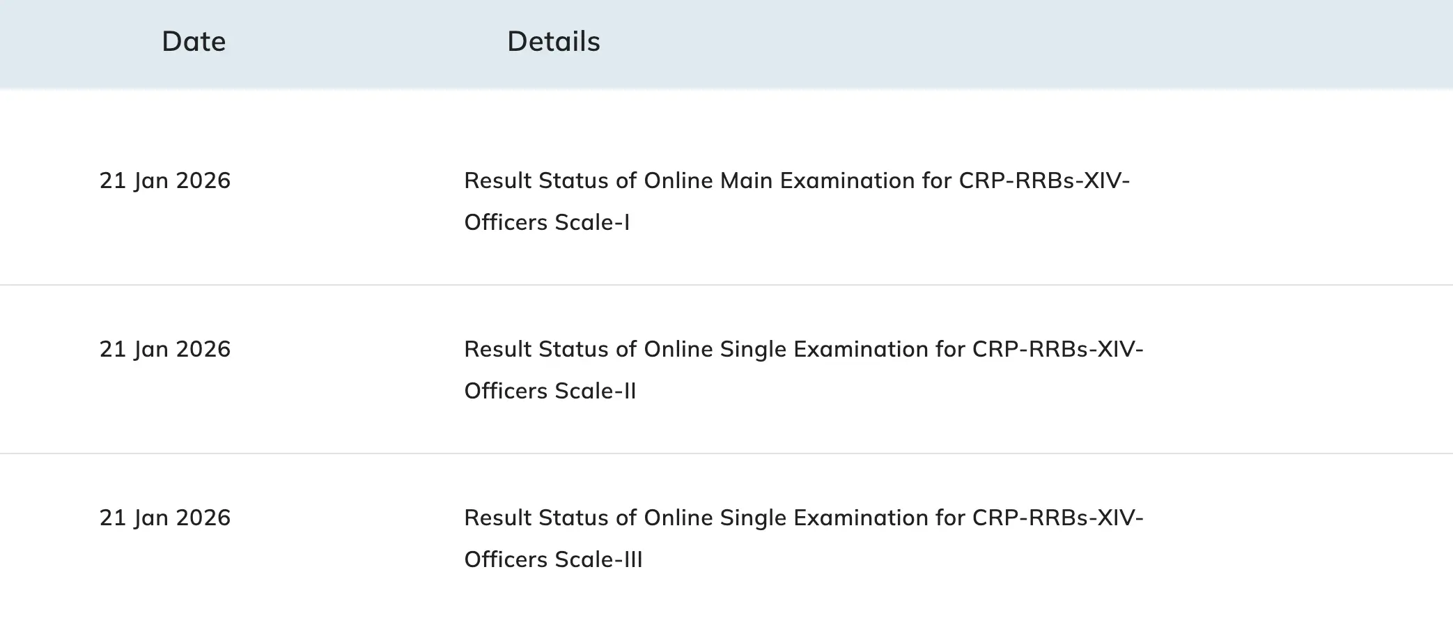 - Click on the notification reading “Result Status for Online Mains Exam CRP-RRBs-XIV-Officers Scale-I” OR “Result Status for Online Single Examination CRP-RRBs-XIV-Officers Scale-II & III”.