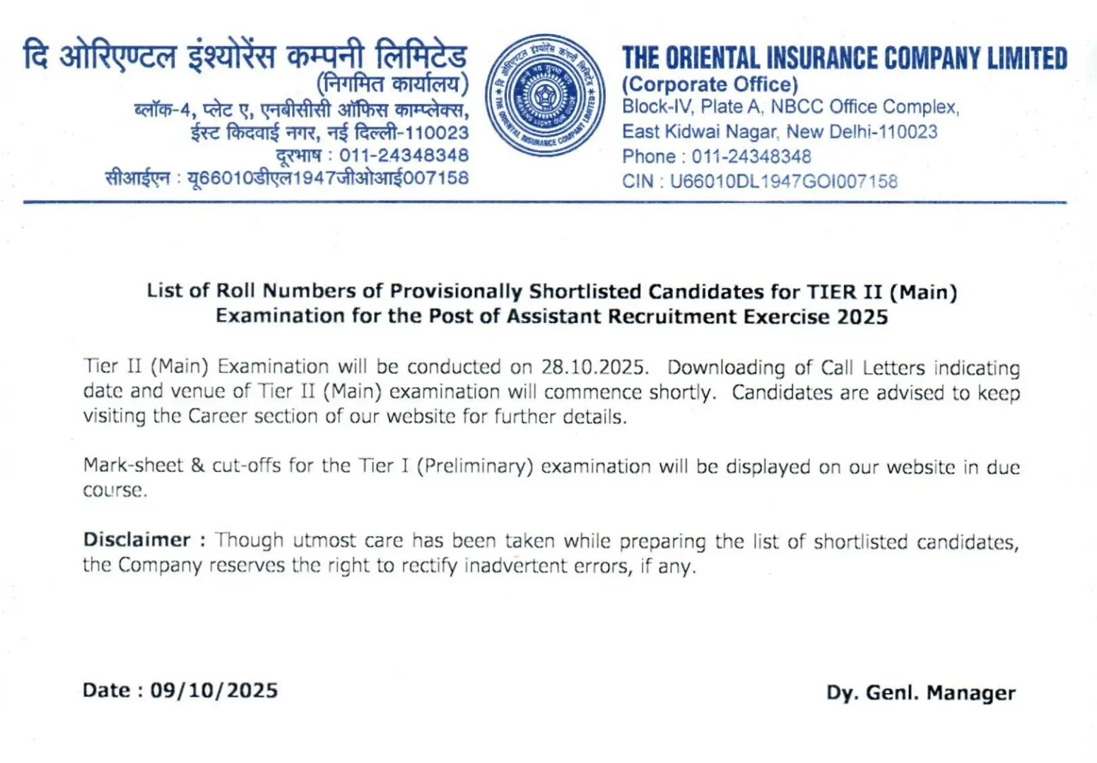 | OICL Assistant Mains Admit Card 2025 | 20th October 2025 |