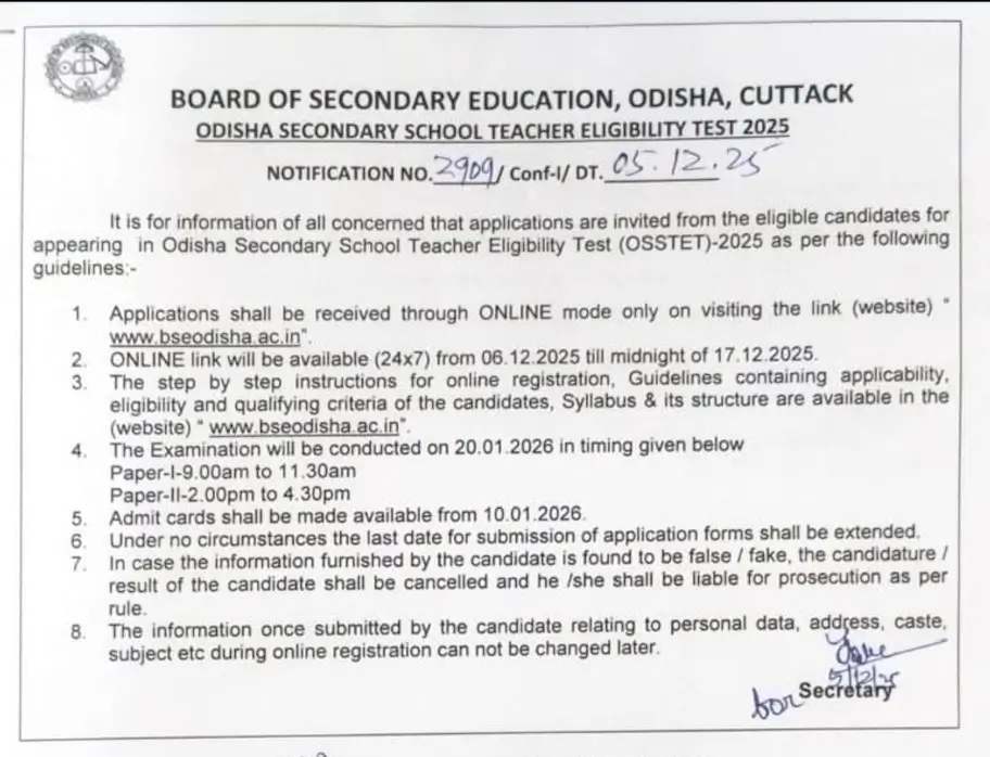 Both papers for Odisha Secondary School Teachers Eligibility Test-2025 will be conducted on a single day, 20th January 2026, in morning and evening shifts. Along with the official notification,the OSSTET Exam Date 2025, along with shift timings, has been announced.