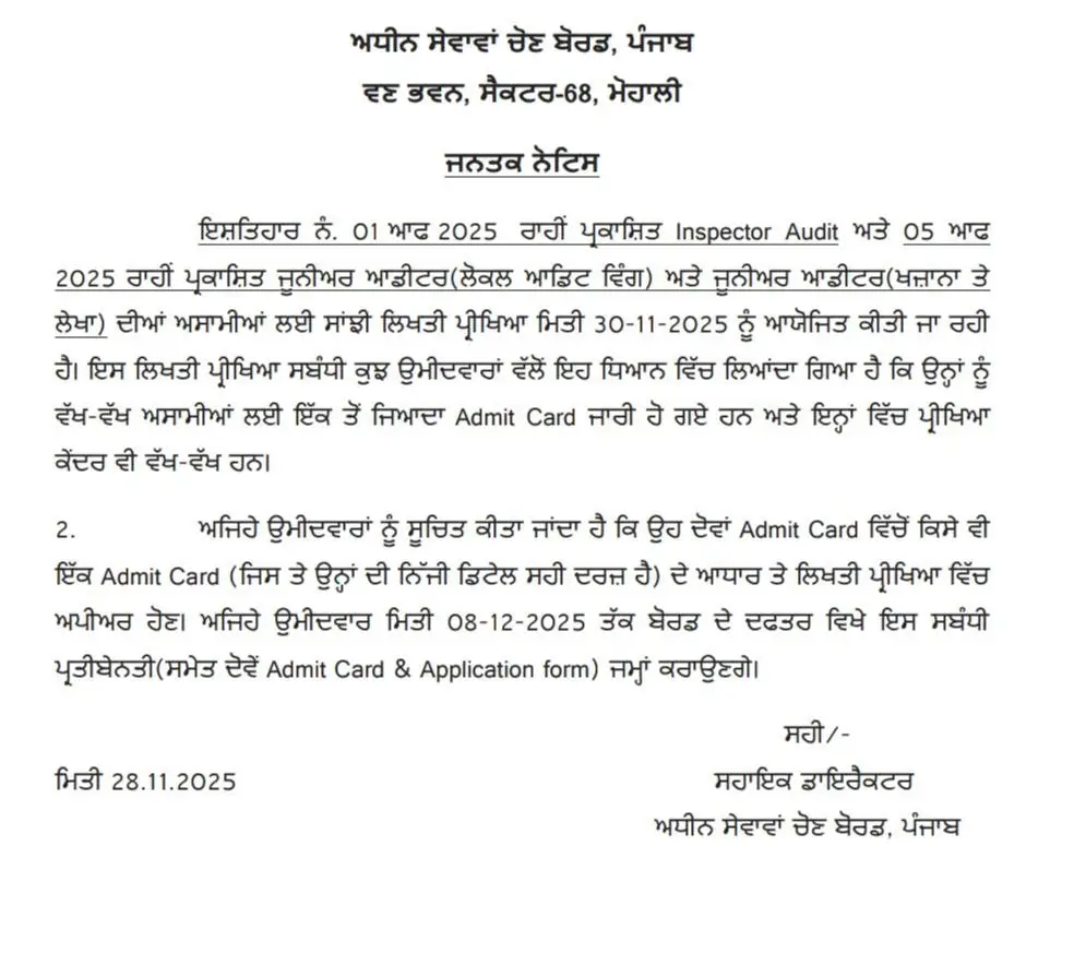 PSSSB Admit Card 2025 for Advt 05/2025 has been released on 27th November 2025 at the official website www.sssb.punjab.gov.in. Candidates who have their written exam on 30th November 2025 for Junior Auditor (Treasury & Accounts), Junior Auditor (Local Audit Wing), and Audit Inspector posts can now download their admit card through the official website of PSSSB. Candidates will be required to enter their Application Number, Date of Birth, and Mobile Number to access their admit card.