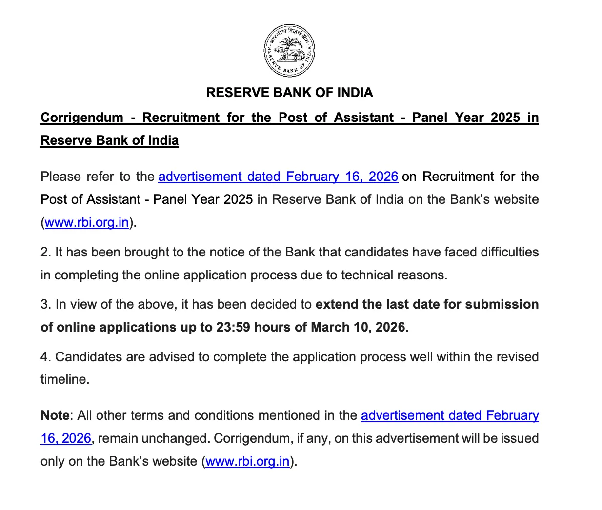 The Reserve Bank of India is accepting online applications for RBI Assistant posts and the last date to apply online is 10th March 2026 (11:59 pm) (extended). The candidates are advised to submit their online applications well before the last minute to avoid any technical errors. The direct link to apply online for the RBI Assistant Recruitment 2026 is also shared below.