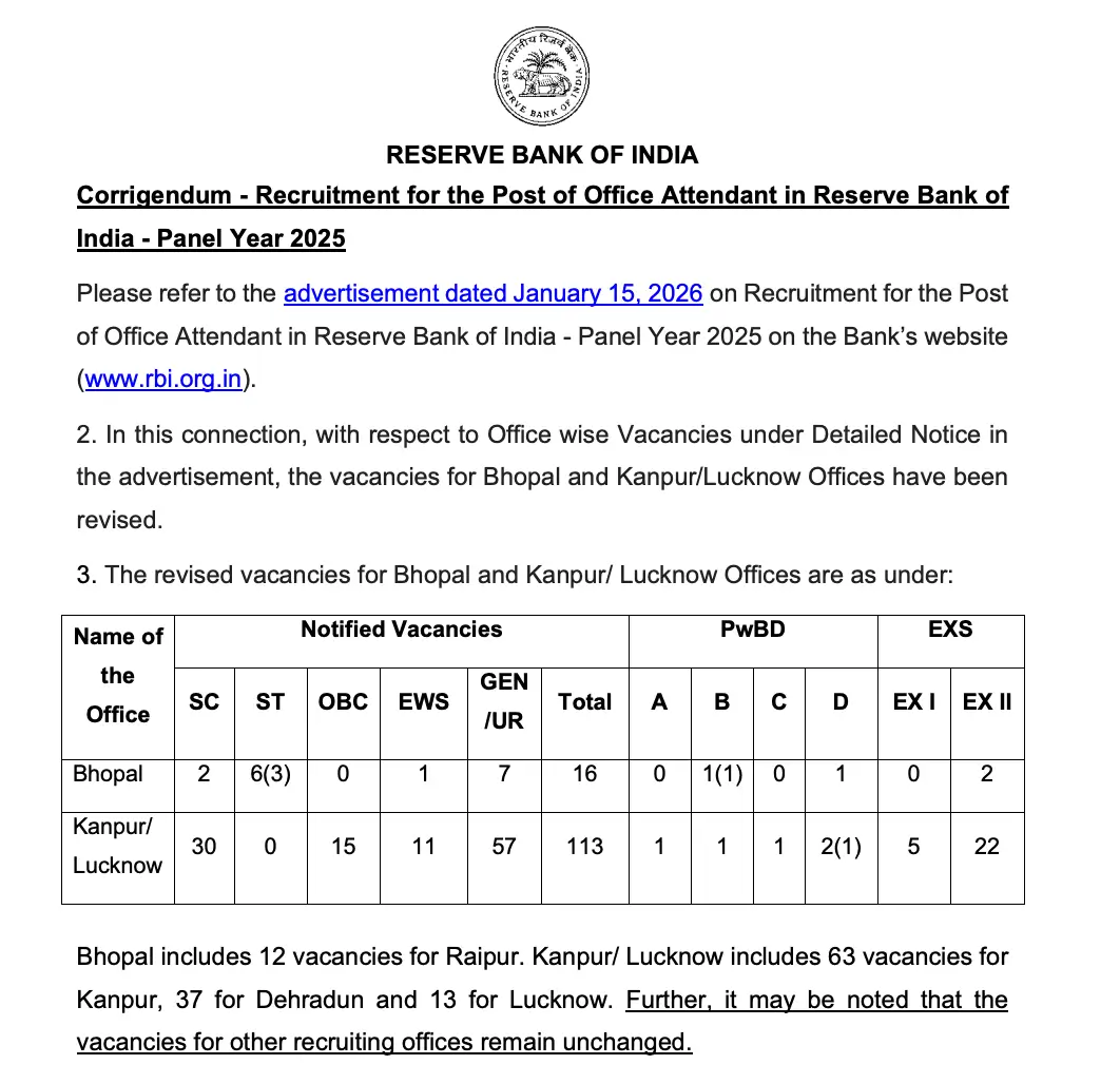 The Reserve Bank of India has released the complete details for the RBI Office Attendant Vacancy 2026 along with its official notification pdf. Candidates willing to apply for the vacancies must check all important details for the recruitment.