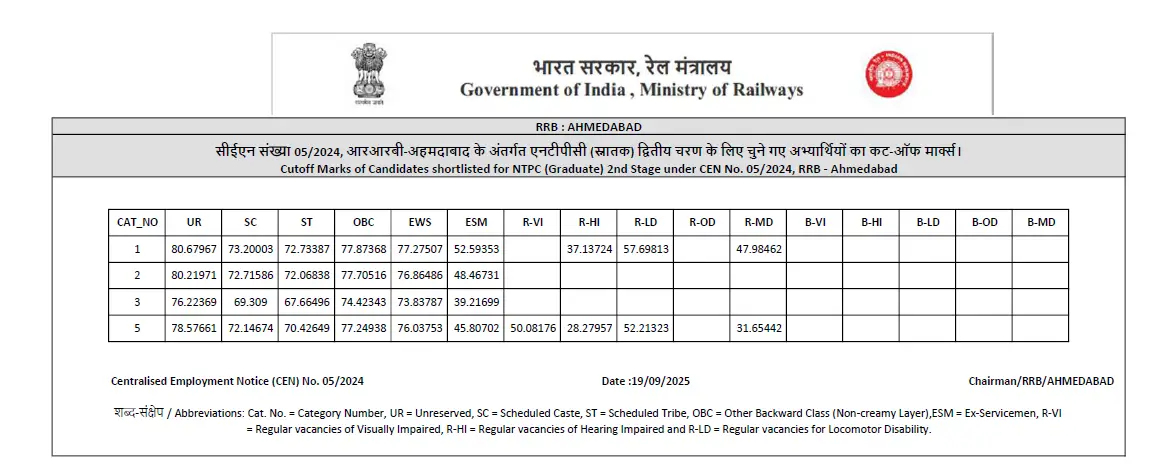 RRB Ahmedabad NTPC Result and Cut Off 2025 Out