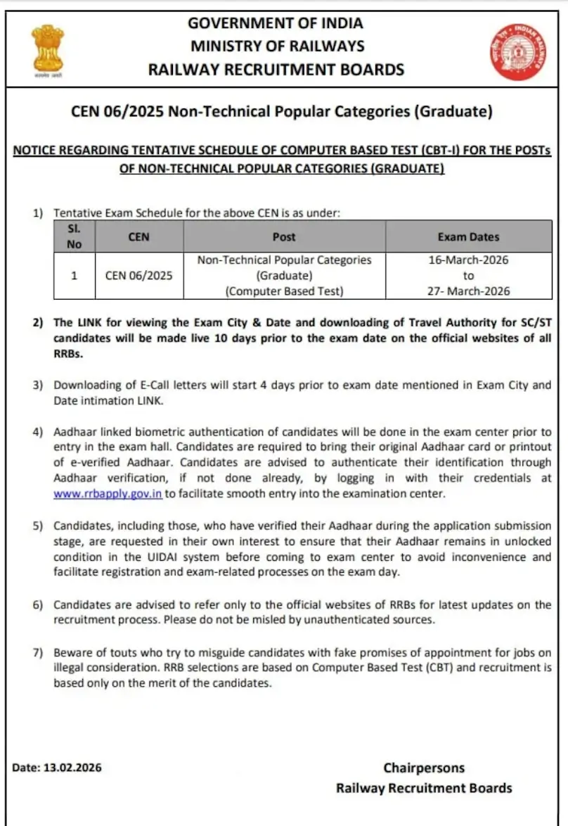 The Railway Recruitment Board (RRB) has released the official notice for RRB NTPC Exam Date 2026 for Graduate level posts (CEN 06/2025) at the official website http://www.rrbcdg.gov.in/. For the candidates who have applied for Graduate Level posts, their exam is scheduled from 16th to 27th March 2026. The details regarding the exam incluidng exam date, timing, exam venue, etc., will be released along with the admit card.