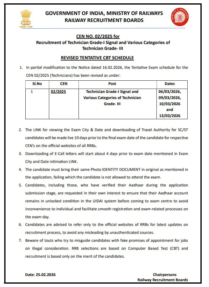 The complete schedule for RRB Technician CEN 02/2025 has been tabulated below.