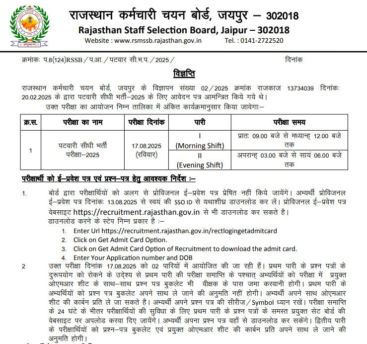 Rajasthan Patwari Admit Card 2025 Release Date Official Notice