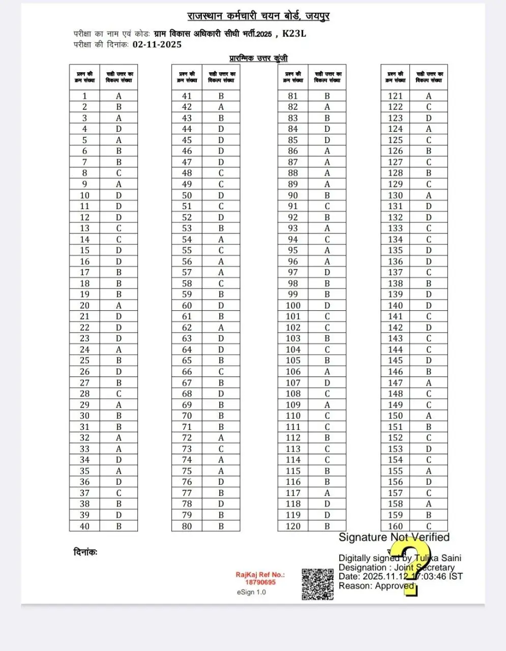 Rajasthan Staff Selection Board (RSSB) has activated the link to download the Rajasthan VDO Answer Key 2025 on 12th November 2025 at its official website www.rssb.rajasthan.gov.in. The snippet of the answer key is also shared here so that candidates are not required to visit the official website of RSSB.
