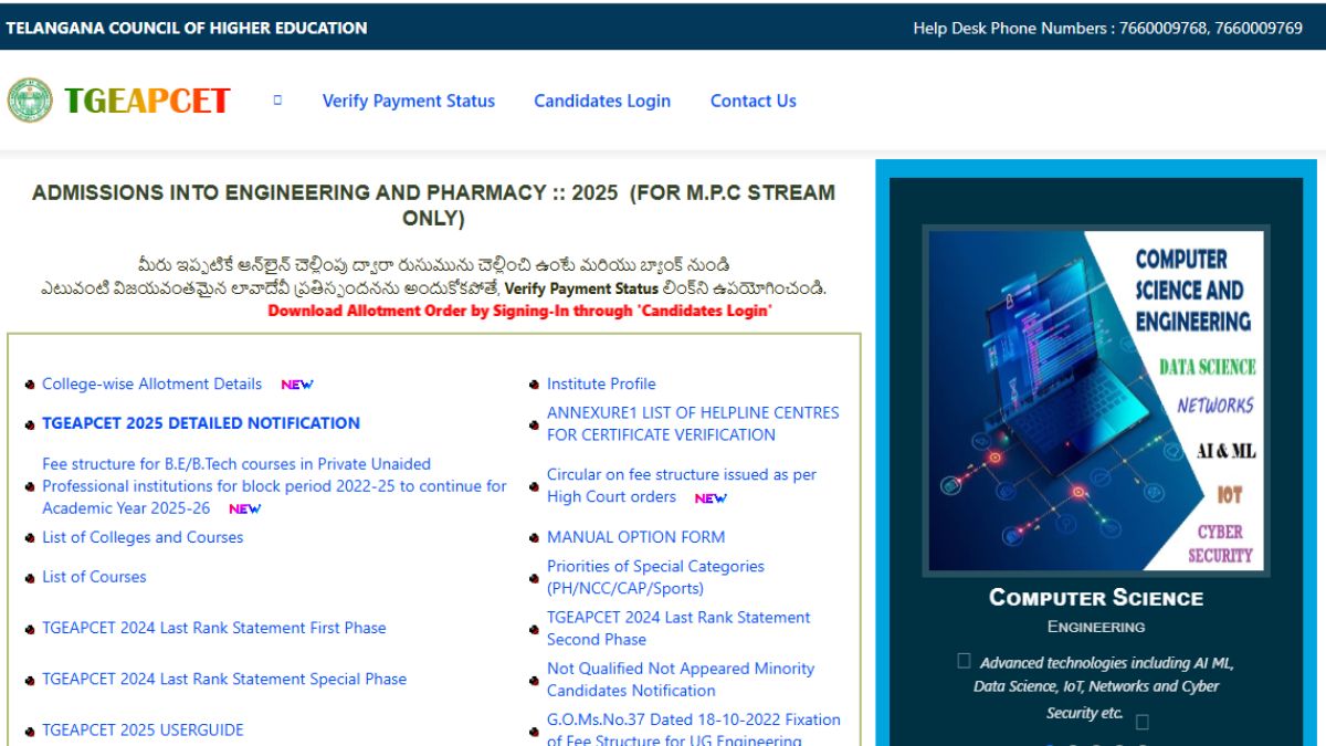 The Telangana State Council of Higher Education has started the process of TS EAMCET Counselling 2025 at its official website. All the aspirants who are looking for admission into various engineering, agriculture and pharmacy courses in the Telangana State Universities can now visit the official website of TSCHE at www.tgeapcet.nic.in to check and download the college wise seat allotment list 2025.