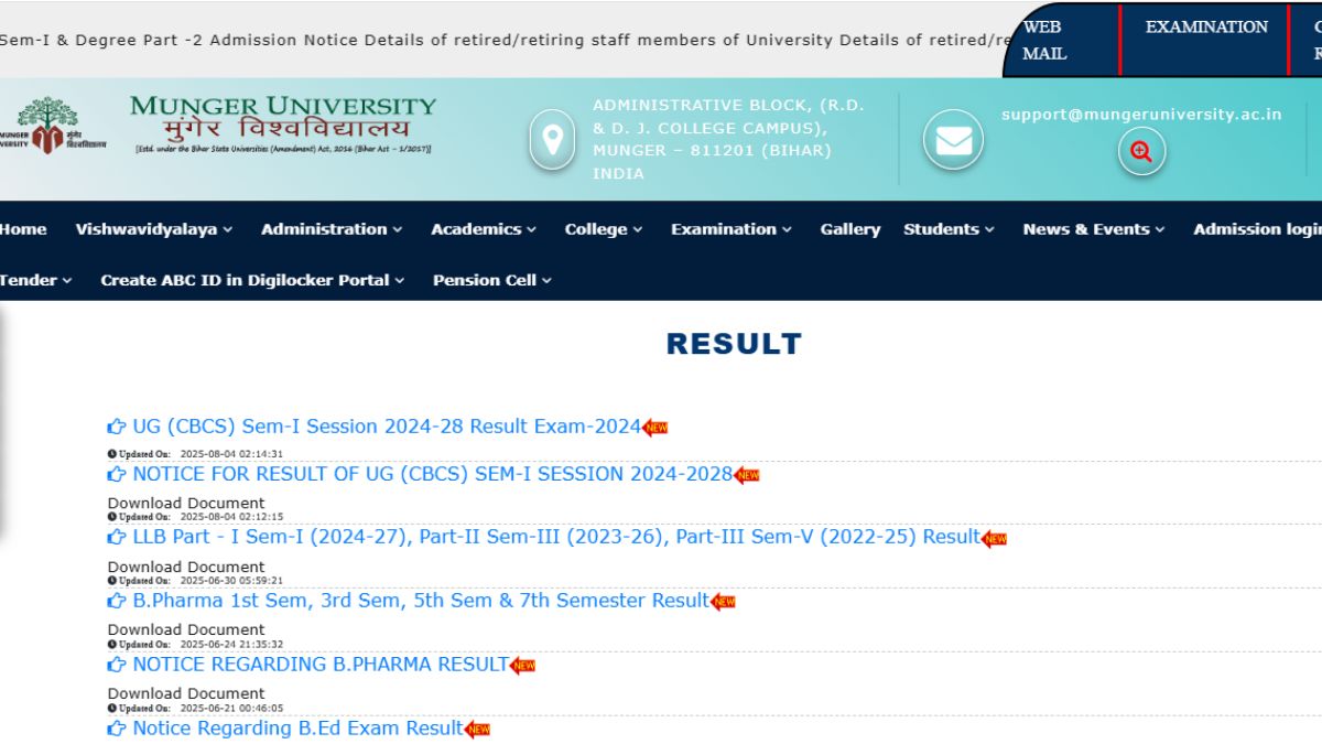 After completion of the semester exams, Munger University, Bihar has announced the results for the BCom, BA, BPharma, BCA, MA, and MSc students at its official website. The portal provides all the necessary information for students to check how they performed in their exams and understand their overall results, including grades and pass or fail status.