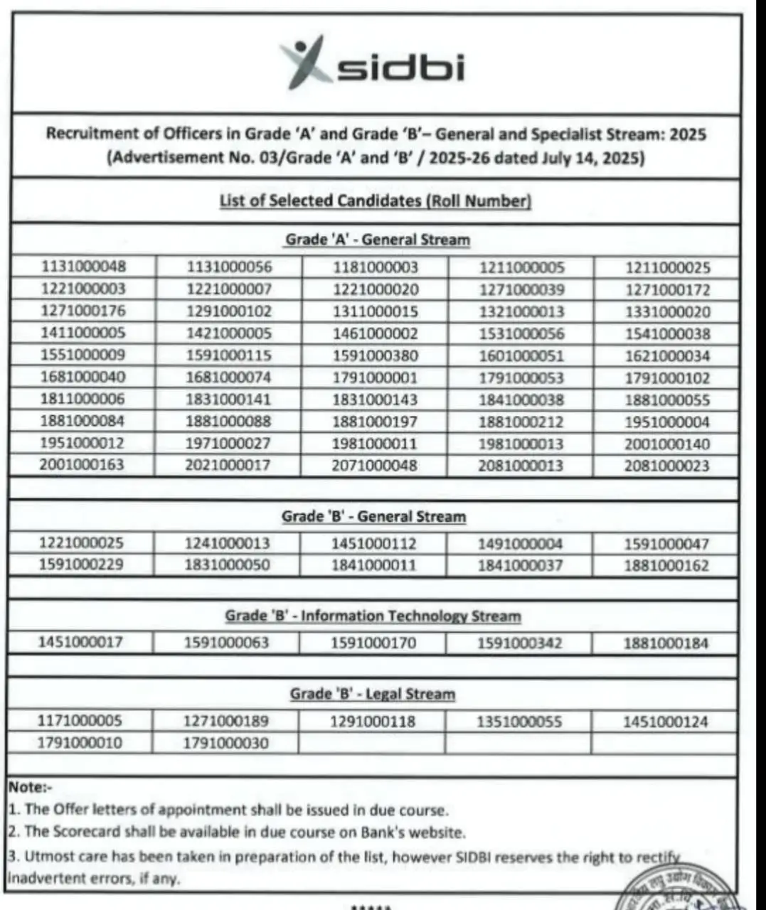 The recruitment for Officers in Grade 'A' and Grade 'B' (General and Specialist Streams) for the year 2025 against 76 vacancies has been announced under Advertisement No. 03/Grade 'A' and 'B'/2025-26. The Phase II Exam has been successfully conducted, and now the SIDBI Grade A and B Result 2025 listing the roll numbers of candidates selected for released posts (for General and Legal Streams) has been officially released.