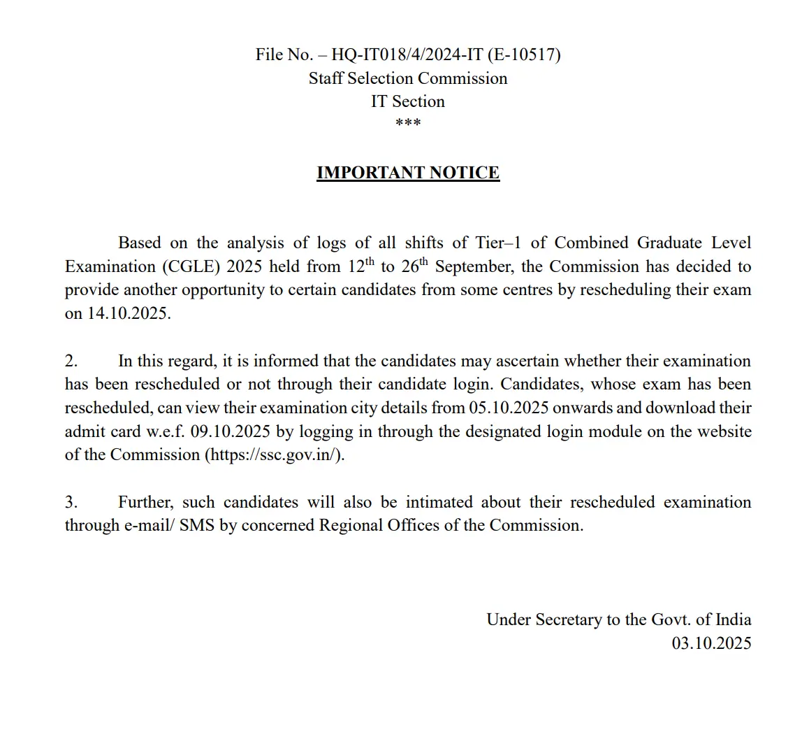 | SSC CGL City Intimation 2025 | 5th October 2025 |