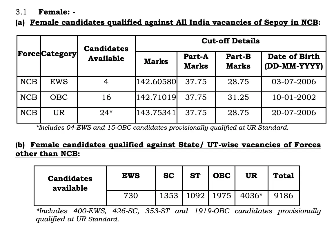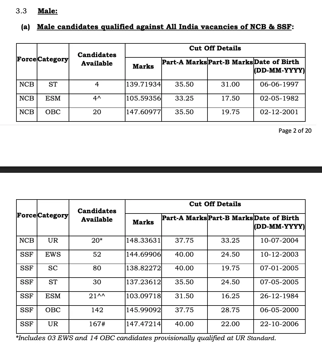 | Force | Category | Marks of the Last Shortlisted Candidate | Part-A Marks | Part-B Marks |