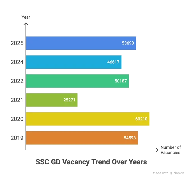 Last year the total number of vacancies was 53690. You can also check the last 6 years of vacancies announced through the SSC GD Constable Exam.