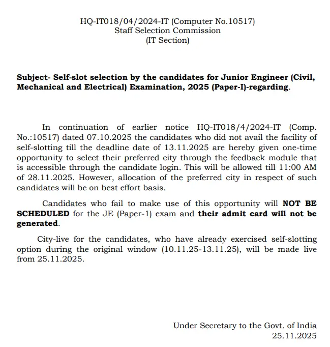 The SSC JE 2025 Exam has been scheduled to be conducted from 3rd to 6th December 2025. The candidates who missed the earlier chance to choose their exam slot (as per notice dated 07.10.2025) and did not complete self-slotting by 13th November 2025 are being given one more chance. They can now select their preferred exam city using the feedback module available in their candidate login. This option will remain open till 11:00 AM on 28th November 2025. However, the exam city will be allotted only on a best-effort basis, which means the preferred city may or may not be available.
