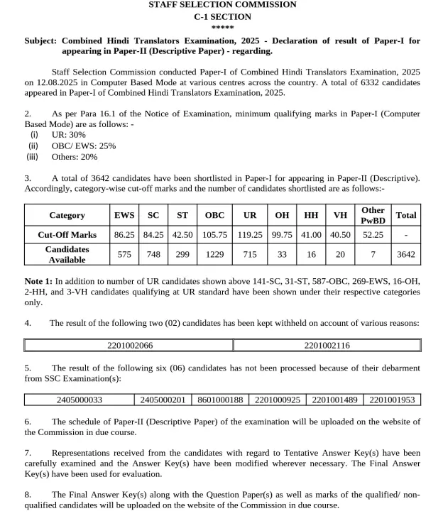 - Click on the “SSC Combined Hindi Translators Computer-Based Examination 2025 (Tier-I)- Candidates provisionally shortlisted in Tier-I for appearing in Tier-II Examination” Result Links for the posts you have appeared in the exam.