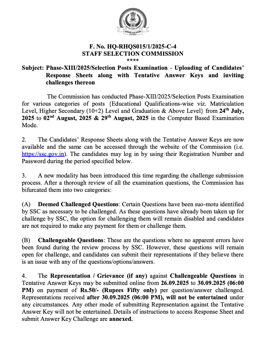 SSC Phase 13 Answer Key 2025- Raise Objections