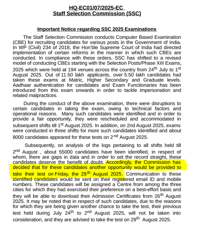 SSC is going to reconduct the SSC Selection Post Phase 13 Computer-Based Examination on 29th August 2025 for all 55000 candidates who faced the technical and operational issues during the original exam held from 24th July to 2nd August 2025. The admit card and application status will be re-released on 26th August 2025 at the official website https://ssc.gov.in/.
