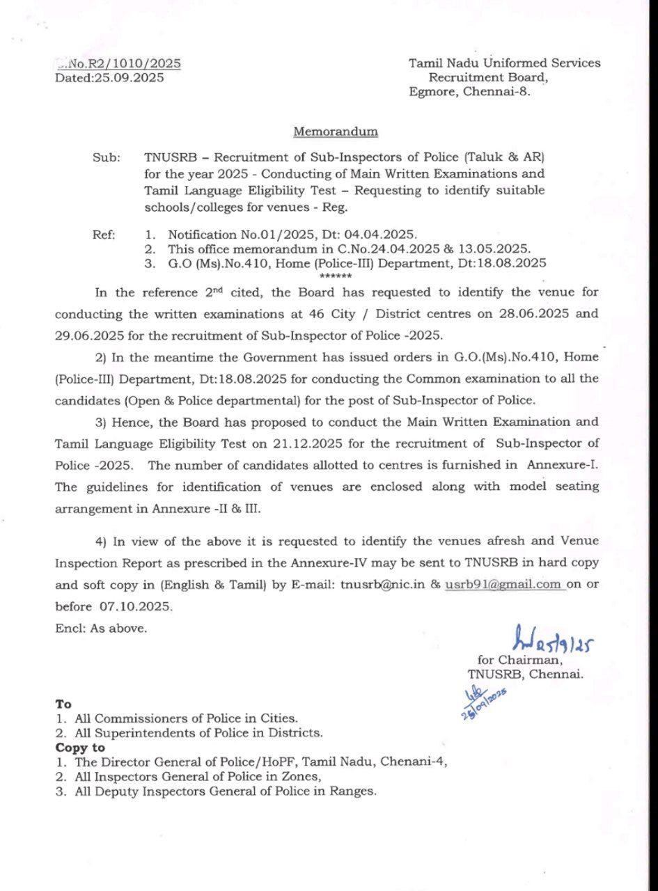 The Tamil Nadu Uniformed Services Recruitment Board has released the official notice regarding the exam date for TNUSRB Sub-Inspectors of Police (Taluk & AR) 2025 written examinations and Tamil Language Eligibility Test for both open and departmental candidates. As per the official notice, the TNUSRB SI Exam Schedule for 1299 Sub-Inspectors posts will be held on 21st December 2025.